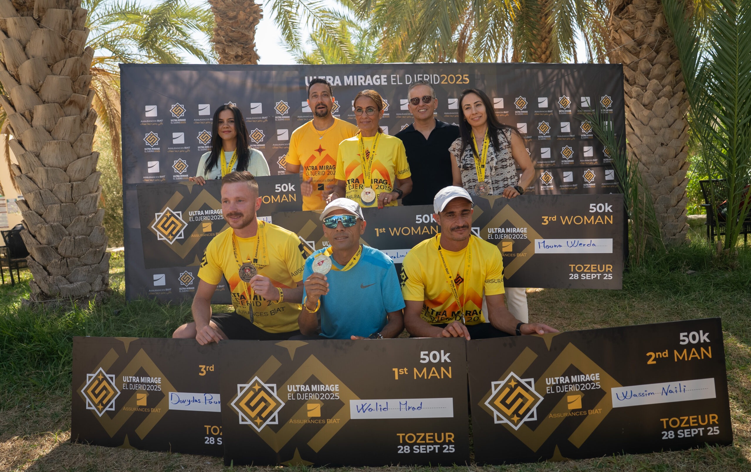 Quant à la nouvelle épreuve Assurance BIAT Trail 25 km, Mourad Zamouri a décroché la première place en 1 h 59 min 33s, tandis que Josephine Durin s’est distinguée chez les femmes avec un temps de 3 h 11 min 31s . Ces performances de haut niveau ont consolidé la renommée internationale de l’Ultra Mirage El Djérid, confirmant son statut d’événement sportif emblématique du désert tunisien et rendez-vous incontournable de l’ultra-trail mondial. Les taux de finissants, particulièrement élevés, reflètent la rigueur et la détermination, détermination des coureurs : 97 % sur le 25 km, 92 % sur le 50 km et 86 % sur le 100 km.