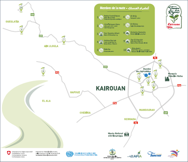 Les membres actuels de la Route sont situés à Kairouan centre ainsi que dans les régions de Oueslatia et Haffouz, contribuant à une mise en valeur élargie du territoire. Un dixième membre viendra prochainement renforcer ce réseau : un domaine oléicole situé à El Ala, témoignant de la dynamique de développement et d’élargissement de la Route.