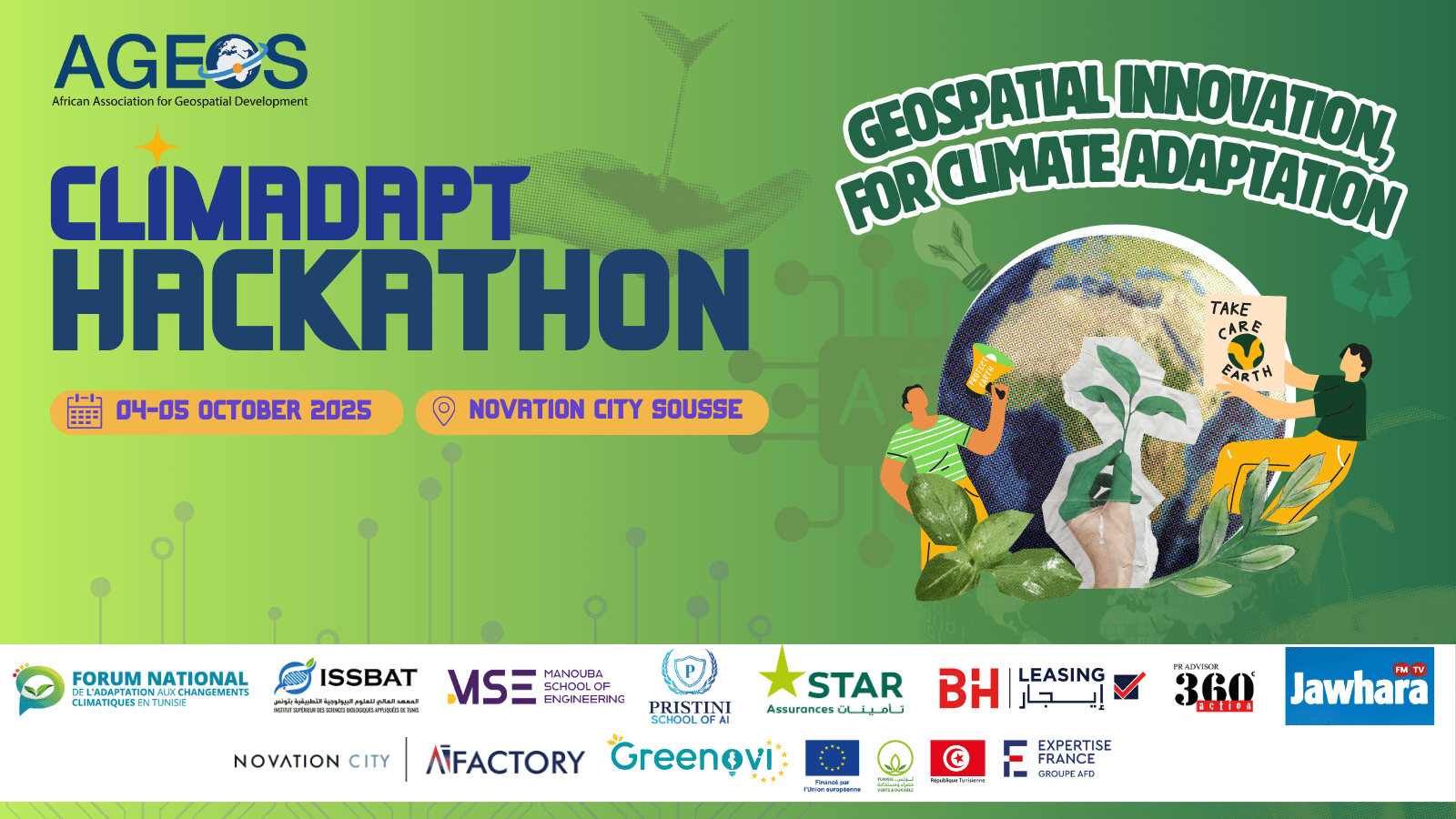 L’African Association for Geospatial Development (AGEOS), en partenariat avec le Forum National d’Adaptation aux Changements Climatiques (FNACC) et plusieurs institutions publiques, académiques et privées, organise, les 04 et 05 octobre 2025 à Novation City, Sousse, le Hackathon ClimAdapt 2025.